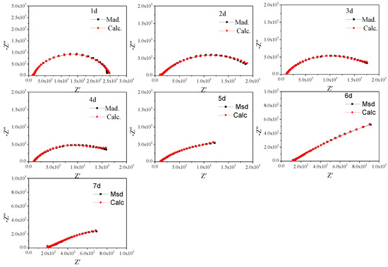 Figure 2 shows the Nyquist diagrams of Q235 steel in sand containing HA solution in the natural air-dried state. With the increasing age, that is, decreasing moisture content, the impedance spectra fluctuate greatly in the frequency area of 103–106 Hz after 8 days. The parts with large fluctuations are not presented and analyzed here. In the frequency area of 10−2–103 Hz, the impedance spectra present a flat capacitive loop, the intersection point with the real axis shifts to the left, and the radius of the capacitive loop decreases first and then increases.