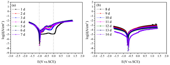Polarization curves of Q235 steel in sand containing HA solution: (a) 1 d–7 d; (b) 8 d–14 d.