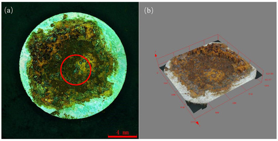 Macroscopic corrosion morphology of Q235 steel in sand containing HA solution: (a) 2D image; (b) 3D image (The area in the red circle will be further analyzed by EDS and XPS).