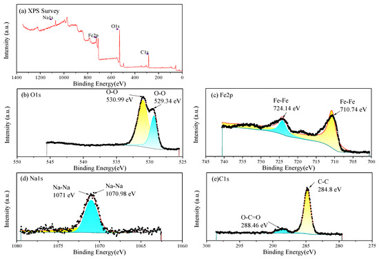 XPS of the corrosion products on Q235 steel: (a) full spectrum and elemental chemical bond analysis: (b) O1s fine spectrum; (c) Fe2p fine spectrum; (d) Na1s fine spectrum; (e) C1s fine spectrum.