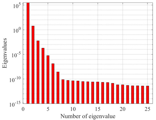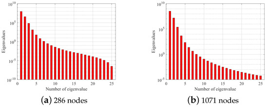 For the purpose of comparison, in this example, three kinds of meshes are used, that is, , and rectangular elements. In fact, there is currently no analytical solution to the problem, but we also use the solution given in ref. [25] as the reference solution of the problem, just like Yao et al. [8]. For all tests in the example, we take the time step and the snapshots are generated by FEM. The first 25 eigenvalues of the snapshots matrix for elements and elements are shown in Figure 4. From the numerical point of view, the size of the eigenvalues drop very quickly, and the accumulation of the first three eigenvalues accounts for more than 99% of all the eigenvalues. Thus, we take in this example for all the nodal distribution, that is, we only need 10 POD basis.