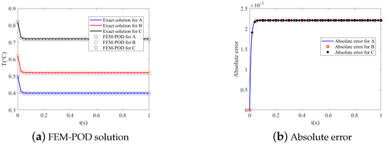 Figure 2 illustrates the correlation between the quantity of POD bases and the norm error when and using square elements at . Evidently, a limited number of POD bases suffice to minimize the norm error, highlighting the FEM-POD’s efficiency in significantly diminishing unknown variables while maintaining satisfactory computational precision. Furthermore, as the number of POD bases r increases beyond a certain threshold, the norm error plateaus. Additionally, Figure 3 compares the numerical solutions at points A, B and C between the FEM-POD approach and the exact solution, revealing excellent alignment between the two sets of results.