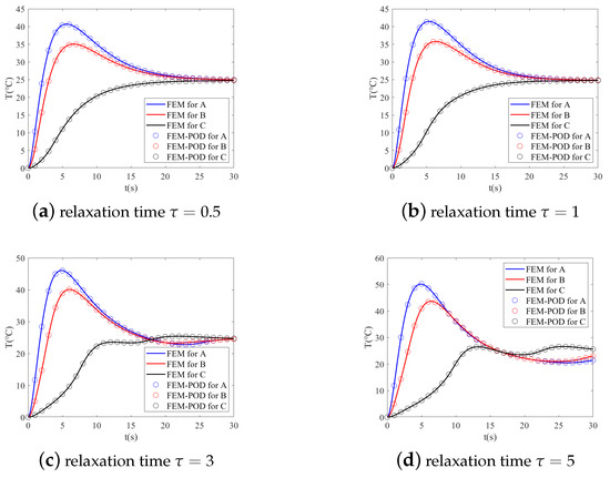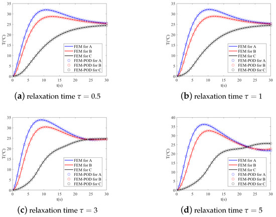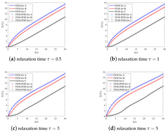Table 2 and Table 3 show the comparison of the results obtained by FEM, FEM-POD and the reference solution taken from [8]. The results demonstrate that the FEM-POD solutions are in good agreement with both the reference solution and the FEM solutions, regardless of whether a time-independent or time-dependent laser heat source is used. This indicates that FEM-POD has a high level of computational accuracy for non-Fourier heat conduction problems. To assess the computational accuracy of FEM-POD, Figure 5, Figure 6 and Figure 7 compare the computed temperature histories at point A, point B and point C using FEM-POD and FEM with varying relaxation times and laser heat sources. It is clear from these figures that, at first glance, the present numerical solutions are very close to the FEM solutions under the different relaxation time and laser heat source. For the time-independent laser heat source, the temperatures at the three points increase with time as shown in Figure 5 for all considered relaxation time. For the time-dependent laser heat source, the temperatures at points A and B increase rapidly with time and reach a maximum value, and then decreased slowly. However, the temperatures at point C generally increase with time for four different relaxation times. Table 4 illustrates the computational times of both FEM and FEM-POD across different nodal distributions, utilizing parameters of , and at s. It is evident that, for identical node distributions, FEM-POD consistently demonstrates a reduced computational time compared to FEM. Furthermore, as the number of nodes increases, the computational time saved by FEM-POD becomes more pronounced in comparison to FEM, highlighting its effectiveness in enhancing computational efficiency.