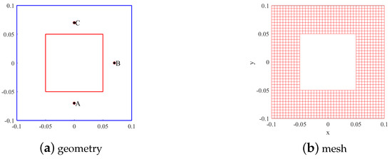 In this example, we consider a large square domain denoted by which contains a smaller square hole represented by as depicted in Figure 8a. The material properties within this domain are characterized by a heat conductivity of , a heat capacity of , and a density of . Additionally, a relaxation time of s is specified. The initial conditions are set to 0 °C throughout the domain. The outer lower boundary is maintained at a temperature of 100 °C while the Robin boundary conditions are applied to the remaining boundaries. These Robin conditions involve a heat transfer coefficient of and an ambient temperature of 200 °C. As in the previous examples, here we consider three kinds of meshes, namely 300 elements, 1200 elements (as shown in Figure 8b) and 7500 elements. Meanwhile, the time step and the end time is 250 s.