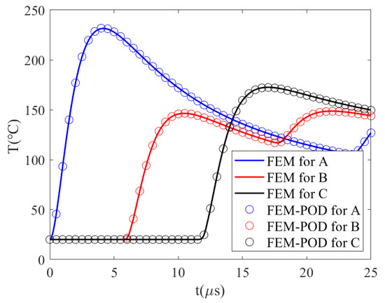 Figure 9 illustrates the eigenvalues for an example comprising 1320 nodes and 1200 elements. Notably, these eigenvalues exhibit a rapid decay pattern. Through these computational results, using Equation (21), when we take , the accumulating energy of the whole eigenvalue information will reach 99.99%. Thus, we take 12 POD basis for this example with all meshes. Figure 10 and Figure 11 depict the temperature contours obtained using both FEM and FEM-POD at time instances s and s, respectively, with 1320 nodes. Upon visual inspection of these figures, it is evident that the temperature distributions computed by FEM-POD exhibit strong agreement with those generated by the FEM. To further substantiate the computational accuracy of FEM-POD, a comparative analysis is presented in Figure 12, which compares the temperature histories at points A, point B and point C obtained from both methods. As we expected, the temperatures at three points obtained by FEM-POD matched those obtained by FEM very well. Table 5 presents a comparison of the computational times between FEM and FEM-POD for Example 3, with parameters set to across varying numbers of nodes. The data unequivocally demonstrates that FEM-POD offers significant computational savings compared to the traditional FEM when addressing non-Fourier heat conduction problems. This advantage becomes increasingly apparent as the number of nodes and elements increases. This example reinforces the fact that FEM-POD not only maintains computational accuracy but also significantly enhances computational efficiency compared to the FEM. Consequently, the proposed FEM-POD method is highly suitable for rapidly solving non-Fourier heat conduction problems.