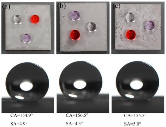 It is well known that a superhydrophobic surface is characterized by both a large static CA (≥150°) and a small SA (≤10°) [26]. Figure 2 illustrates the morphology of water droplets and the corresponding CA and SA values on the surfaces of the RRA-, T6-, and FSA-temper samples. The water droplets were dyed with red and purple ink to better display the shape and outline. Notably, the water droplets on the surface of the composite coating appear approximately spherical, and the CA values of the RRA-, T6-, and FSA-temper samples are all greater than 150°, while the corresponding SA values are all less than 5°. The results, as shown in Figure 2b, indicate that the CA and SA values of the T6-temper sample were 156.5° and 4.3°, respectively. Compared to the RAA and FSA-temper samples, the T6-temper sample shows an excellent superhydrophobic performance.
