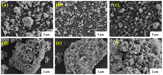 The SEM images of modified SiO2 powder were obtained to confirm the surface morphology and layered microstructure. Figure 3 shows SEM images of the RRA, T6, and FSA temper samples modified with SiO2 powders. As shown in Figure 3d–f, it is evident that the coating comprises micro-scale protrusions with spherical microscopic characteristics at the top. These spherical microscopic characteristics are composed of silica colloidal particles. Low-surface-energy materials were filled into these circular holes during the subsequent preparation of the composite coating. The KH550 combined with modified silica nanoparticles formed an island distribution, thereby developing a micro/nanostructure.