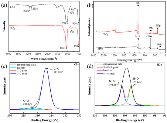 (a) FTIR spectra and (b) XPS survey spectra of SiO2 and SKS powders; (c) C1s and (d) Si2p bands in high-resolution spectra.