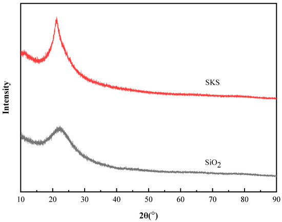 Figure 5 depicts the X-ray diffraction (XRD) patterns of the unmodified and modified SiO2 powders. Upon the analysis of SiO2 and SKS powders, it was indicated that the wide XRD reflection peak may be attributed to the small size of the prepared particles and the incomplete internal structure. The curves with a high degree of coincidence indicate that the materials are not simply mixed together. With the addition of KH550, SiO2 still exhibits an amorphous structure, which indicates that the modification does not alter the crystal structure of SiO2.