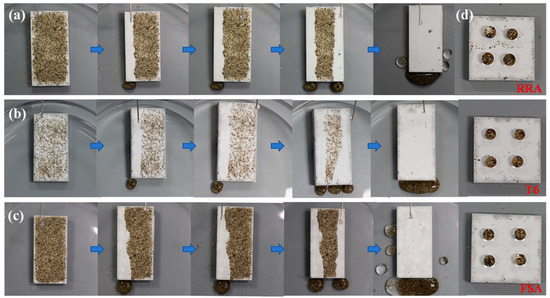The self-cleaning property procedure of (a) RRA, (b) T6, and (c) FSA samples in oblique position; (d) self-cleaning state in horizontal position of RRA, T6, and FSA samples.
