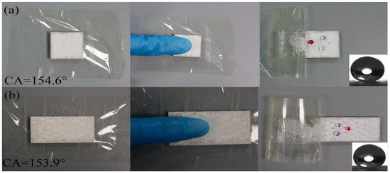 Mechanical wear is used to further evaluate the mechanical durability of superhydrophobic coatings. The detailed process of the mechanical wear test is as follows: The sample was turned upside down on 1200-grit sand paper, and then the samples were pushed along the straight edge with a weight of 100 g. Figure 8 shows the experimental process of the mechanical wear test on the superhydrophobic surface and corresponding CA test. The superhydrophobic coating of the sample was pushed 20 cm along the sandpaper, leaving a white mark on the sandpaper. It was observed that water droplets could be placed three-dimensionally on the surface of the sample and still maintained contact after the mechanical wear test, similar to their state before the wear test. The CA and SA values also indicate that the developed coating possessed good superhydrophobicity and wear resistance.