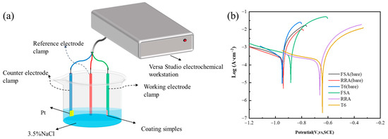 Electrochemical test: (a) electrochemical test mode; (b) Tafel polarization curves of bare alloy and superhydrophobic coating under RRA, T6, and FSA conditions after immersion in 3.5% NaCl aqueous solution for 5 days.