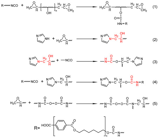 The low-molecular-weight polyester was synthesized by reacting a specific amount of PTA sludge waste and the corresponding 1,6-hexanediol (with a molar proportion of carboxyl and hydroxyl groups (-COOH/-OH) of 1:[1.1–5]) in a 100 mL three-necked flask at 230 °C for 5.5 h. Subsequently, the polyester was dried in a vacuum oven at 120 °C for 2 h. After being cooled to room temperature, appropriate amounts of MDI-50 and polyester (with a molar ratio of -NCO/-OH [3,4,5]:1) were switched to a 100 mL triple-necked laboratory flask. Then, DMF (200% of the mixture) was incorporated into the reactor system. The reaction device (chemical engineering) was warmed to 50 °C in a kettle bath for 1 h. After 1 h, the capping agent [45] (imidazole) was added to the flask slowly and dropwise (with a 1:1.5 molar ratio of -NCO/-NH). The oven was gradually raised to 60 °C and held for 2 h while the system was swirled continuously and purged with N2 gas.