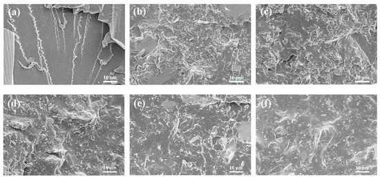 SEM of materials with different curing agent contents. (a) Control group, (b) 20%, (c) 25%, (d) 30%, (e) 35%, (f) 40%.
