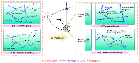 Schematic representation of the molecular network of the cured epoxy resin before (a,b) and after impact (c,d), as well as for the control (a,c) and the samples (b,d).