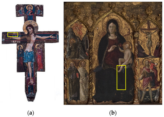 (a) Wooden painted cross from the 13th century, (b) Panel painting “Madonna in trono con Bambino, miracolo delle stimmate di San Francesco, Santi Antonio Abate e Bartolomeo, Crocefissione, San Cristoforo” by Arcangelo Di Cola. The areas under investigation are indicated by the highlighted yellow rectangles and they measure approximately 3 × 10 cm2.
