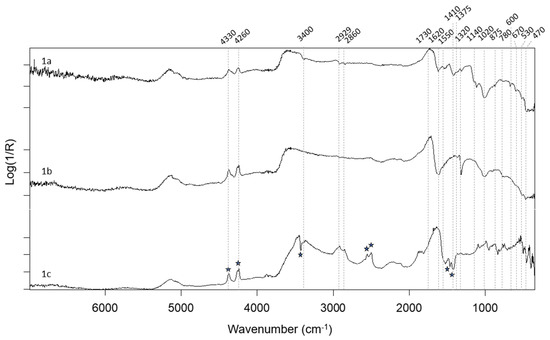 rFTIR spectra of 1a, 1b, and 1c points. The spectral features assigned to azurite are labeled as “*”.