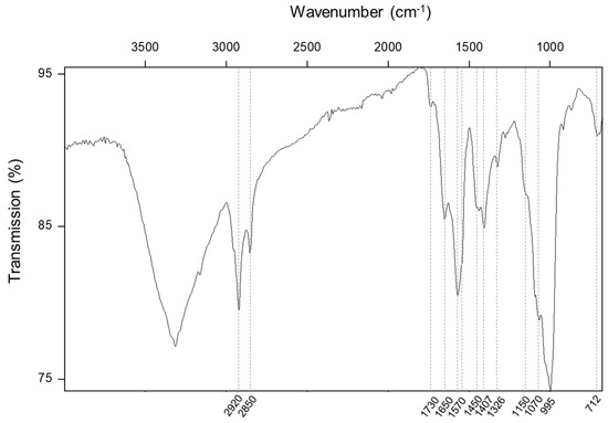 - Proteins revelated by the bands at 1650 and 1550 cm−1, attributed to the carbonyl stretching vibration (C=O) of the amide I and to a mixture of N-H bending and C-N stretching modes of the amide II, respectively [42].