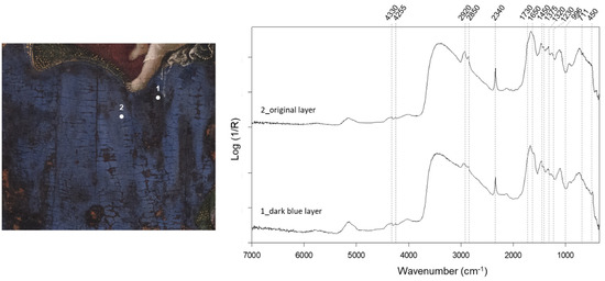 Micro-FTIR analyses were performed on some samples of the cross. In this study, we present the spectra obtained from two samples taken from the superimposed layer above the blue background, near the right hand of Christ. As depicted in Figure 2, measurements on one sample revealed absorption bands indicative of the following: