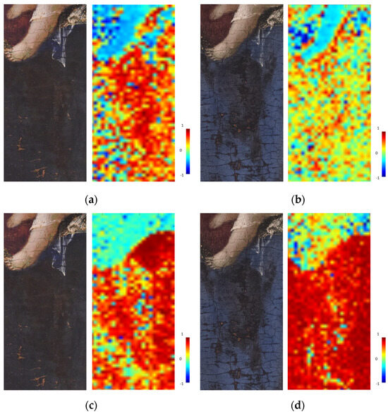 (a) Visible image and the correlation map of the calcium oxalate (ROI: 1400–1200 cm−1) before the cleaning processes. (b) Visible image and the correlation map of the calcium oxalate (ROI: 1400–1200 cm−1) after the cleaning processes. (c) Visible image and the correlation map of lapis lazuli (ROI: 2290–2370 cm−1) before the cleaning processes. (d) Visible image and the correlation map of lapis lazuli (ROI: 2290–2370 cm−1) after the cleaning processes.