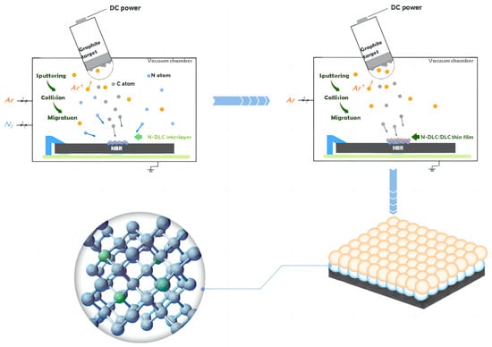 Nitrile butadiene rubber (NBR) is a synthetic rubber that has excellent oil and heat resistance, making it suitable for various applications such as seals and bearings in the marine engineering and aerospace industries [,,,,]. However, NBR is susceptible to significant friction and wear when it comes into contact with engineering materials, resulting in potential material loss and seal failure. Currently, numerous researchers have sought to address the shortcomings of NBR by enhancing formula design and processing technology. However, despite these efforts, various challenges remain in improving the tribological properties of rubber through surface modification and process optimization. Simultaneously, the adhesion between the substrate and the material of surface modification should also be considered [,,]. Surface modification can significantly improve the surface wear resistance of materials without changing the matrix, and it has been studied for rubber surface modification. Diamond-like carbon (DLC) is an appealing coating material for NBR because of its characteristics such as low friction, high hardness, and chemical inertness [,,]. However, there are a few obstacles to overcome in the deposition of DLC films on NBR substrates, including insufficient adhesion, excessive residual stress, and mismatched mechanical characteristics.