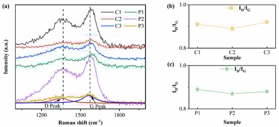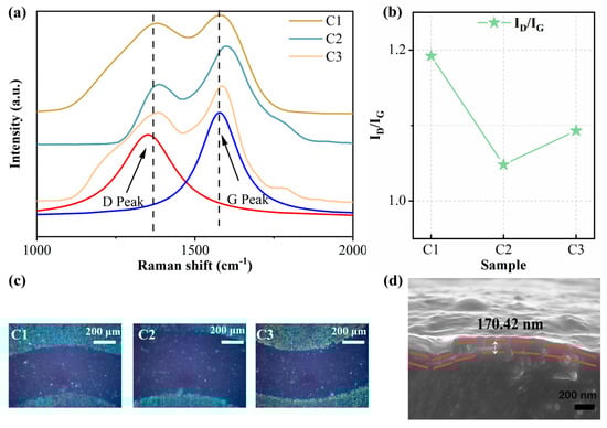 In order to investigate the abrasion resistance of DLC films on rubber substrates, film wear measurements were carried out, and the results are shown in Figure 7b. Under dry friction conditions, the highest wear rate was observed for NBR. Both the quantity of wear and the coefficient of friction were considerably lower following the DLC surface deposition. Among them, C2 with the N-DLC interlayer has the least amount of wear. This is due to the fact that it has the largest H3/E2 and, therefore, better wear resistance []. In order to better study the friction mechanism, the wear traces were analyzed via Raman analysis.