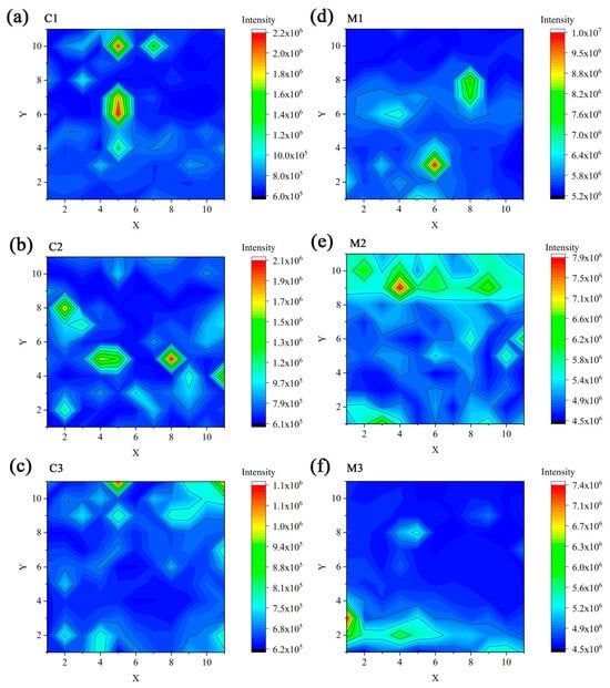 Raman mapping of the deposited N-DLC interlayer and N-DLC/DLC multilayer films (the abscissa and ordinate represent the positions of points, 11 × 11); (a) C1, (b) C2, (c) C3, (d) M1, (e) M2, and (f) M3.