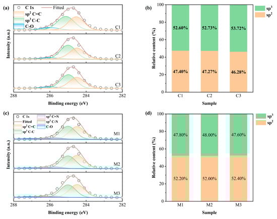 It is worth mentioning that, when nitrogen is doped into the DLC film, two peaks appear: C=N (285.9 ± 0.1 eV) and C-N (286.5 ± 0.2 eV); sp3C-N indicates that sp3-hybridized carbon atoms are bonded to nitrogen atoms to form σ bonds; and sp2C=N means that the sp2-hybridized carbon atom is bonded to the nitrogen atom to form a σ+π double bond [,,]. The results show that the nitrogen and carbon atoms in the multilayer films are well bonded. The corresponding content percentages of sp2C=C and sp3C-C obtained from the fitting results are shown in Figure 5b,d, which are consistent with the Raman-derived 0.92, 0.89, and 0.91 (ID/IG) for the N-DLC/DLC composite coatings. N1s spectra of the interlayer were also decomposed into sp2N=C and sp3N-C bonds. The change tendency of sp2N-C/sp3N-C is the same as that shown in Figure 5d. The detailed information can be seen in the Supplementary Materials and Figures S2 and S3. In particular, the N-DLC interlayer sp2/sp3 results of 1.09, 1.03, and 1.10 (M1, M2, and M3, come from Figure 5d) are significantly different from the multilayer films with sp2/sp3 values of less than one. This is because N doping encourages the film’s graphitization process [].