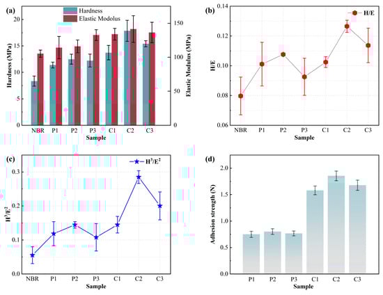 (a) Hardness and Young’s modulus; (b) H/E values; (c) H3/E2 values; and (d) adhesion strength of NBR coated with composite film and DLC.