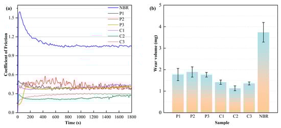 (a) Coefficient of Friction and (b) wear volume of NBR coated with composite film and DLC.