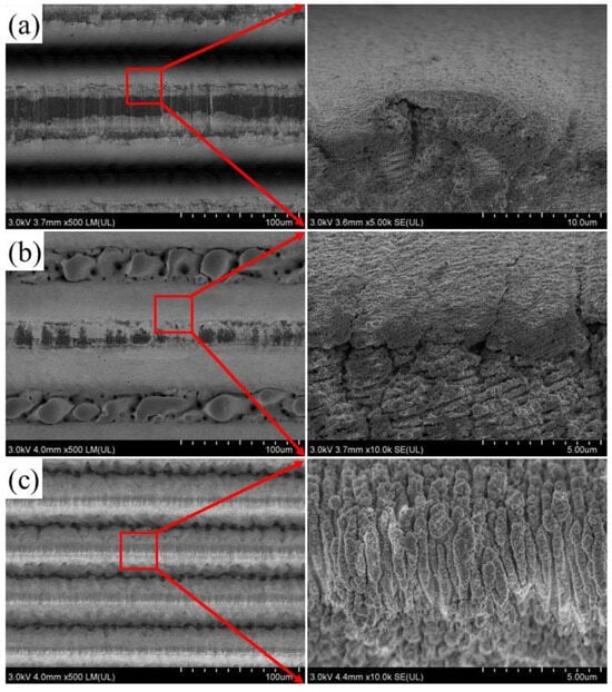 In Figure 3, the structure of ultrafast-laser-textured surface grooves is depicted. Panels (a) and (b) display the ultrafast-laser-textured grooves structures with areal densities of 50% and 70%, respectively. Both images reveal a recast layer on the inner wall of the grooves, along with a multitude of cracks and laser-induced structures at the groove’s edge. Panel (b) additionally exhibits evidence of melting at the groove’s base. Panel (c) portrays a groove structure with a surface density of 90%, where a laser-induced strip structure of 1–5 μm is prominent at the groove’s center.