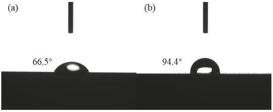 To enhance the contact angle, the samples underwent treatment with low-surface-energy modification. Figure 5 illustrates the contact angles before and after the laser modification of the Ti samples. Initially, the contact angle of the Ti surface was 66.5°, indicating the surface presented hydrophilic properties with the droplets. After modification, the contact angle of the Ti increased to 94.4°, reducing the surface energy, enlarging the contact angle, and improving the hydrophobic properties.