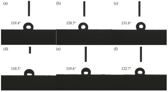 Contact angle of (a) Kt1, (b) Kt2, (c) Kt3, (d) Ct1, (e) Ct2, and (f) Ct3.