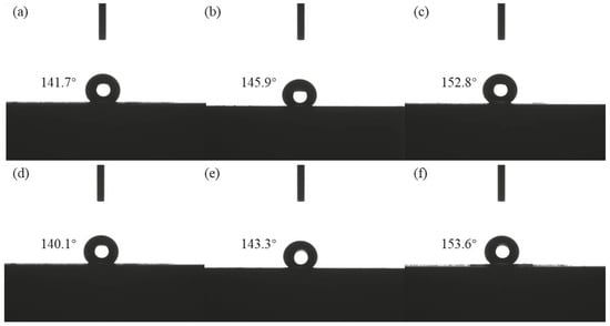 Figure 6 displays the contact angles of the circular pit and groove structures. The contact angles for K1, K2, and K3 were 119.4°, 120.5°, and 131.6°, respectively, demonstrating some level of hydrophobicity, though not achieving superhydrophobicity. Similarly, C1, C2, and C3 exhibited contact angles of 110.3°, 119.6°, and 122.7°, respectively, indicating some hydrophobicity without reaching superhydrophobicity. The contact angle gradually increased with the area proportion of the circular pits and grooves, in accordance with the Cassie wetting model. As the area proportion of these recessed structures increased, the proportion of air within a unit area also increased, leading to a rise in the contact angle.
