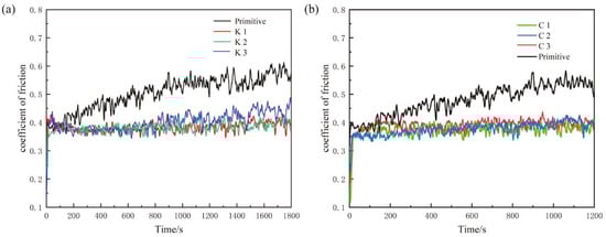 An analysis of the frictional properties of the laser-modified samples K1, K2, K3, C1, C2, and C3 was performed. Figure 8 illustrates the evaluation of the friction coefficients for the textured and non-textured surfaces under a load of 10 N, a scratch length of 2 mm, and a frequency of 2 Hz. The graph highlights that the non-textured sample exhibited a higher and more variable friction coefficient. In particular, Figure 8a shows that the circular pits had a higher friction coefficient with greater fluctuations compared to the grooves. For instance, K1 and K3 displayed higher and more variable friction coefficients. Conversely, K2 exhibited a relatively smaller and more stable friction coefficient. Similarly, Figure 8b demonstrates that C1 and C3 had higher and more variable friction coefficients, while C2 showed a relatively smaller and more stable friction coefficient.