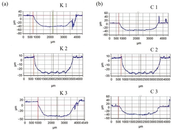 The abrasion contours of the textured surface are presented in Figure 9. Figure 9a displays the abrasion contours of the different pit densities. It can be observed that the abrasion depth of K1 was approximately 59 μm, with an abrasion width of about 3200 μm. The bottom of the abrasion mark was relatively smooth, while the edges were uneven. In contrast, the abrasion depth of K2 was 51 μm, with a width of 3200 μm, and both the abrasion mark and edges were relatively smooth. The abrasion depth of K3 was about 59 μm, with a width of about 3700 μm, and a smooth bottom, with a toothed structure on the right edge of the wear mark. Similarly, Figure 9b shows the contour lines of the abrasion marks of the different groove densities. The abrasion depth of C1 was approximately 36 μm, with a width of about 3160 μm, and a relatively smooth bottom. C2 had an abrasion depth of about 36 μm, a width of about 2800 μm, and a bottom with up-and-down fluctuations in a serrated shape. C3 exhibited an abrasion depth of about 43 μm, a width of about 2900 μm, and a relatively smooth bottom.