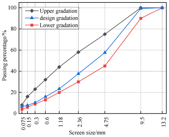 The Marshall test was utilized to develop the RBLM with an AC-10 design grading according to the JTG F40–2004 standard [24]. The RBLM had a 2.0%–3.0% VV, and the void filled with asphalt (VFA) was within 75%–90%. Four Marshall samples with a height of 63.5 ± 1.3 mm were prepared for each group for testing. The optimum asphalt content was determined and verified based on the volumetric indexes and Marshall stability.