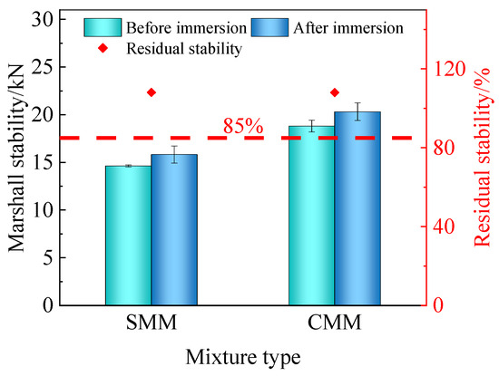 The residual stability of the RBLM, as illustrated in Figure 6, remains consistently above 100%. An interesting observation is noted in this trend: the stability after immersion exceeds that observed before immersion. The increase in stability after immersion is mainly attributed to several important factors. Primarily, the delicate gradation of the RBLM and the higher asphalt content play a crucial role. The abundance of asphalt present enables complete aggregate coverage, thereby enhancing overall stability. Additionally, the smaller VV inherent in the mixture limits the capacity for water infiltration into the asphalt aggregate bonding surface, acting as a protective barrier that effectively mitigates the risks associated with water-induced damage.