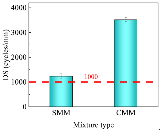 The high asphalt content in the RBLM renders it more prone to deformation and rutting disease than conventional asphalt mixtures. Therefore, assessing high-temperature stability is crucial in evaluating the RBLM’s performance. The wheel-tracking test results shown in Figure 9 reveal that the dynamic stability of the CMM exceeds that of the SMM by approximately three times. Consequently, the CMM exhibits superior high-temperature stability. This result is similar to Table 1. The softening point of composite-modified asphalt is much larger than that of SBS-modified asphalt, making it less prone to deformation at high temperatures.