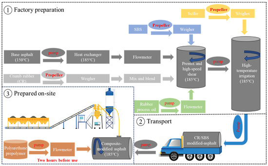 The RBLM’s total mixing time is about 50 s to achieve optimal mixing results. The dry mixing time is approximately 5–10 s, and the wet mixing time is approximately 40–45 s. In contrast to SBS-modified asphalt, composite-modified asphalt must be prepared on-site. It necessitates pouring the polyurethane prepolymer into the CR/SBS-modified asphalt storage tube at least 2 h before mixing to ensure adequate blending. This staged approach is crucial for promoting the homogeneous dispersion of the components, thereby enhancing the overall properties of the asphalt. The detailed process of the CMM is depicted in Figure 10. Understanding and following the CMM production steps can ensure and improve the quality of asphalt pavement construction.
