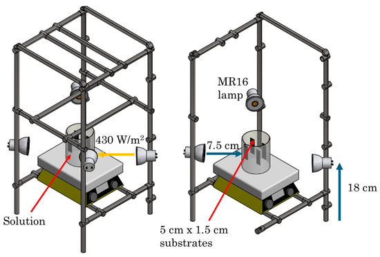 In order to compare the use of powders in solution versus that of the coatings, different amounts of CuO were evaluated in the degradation of MB. Initially, 180 mL of bidistilled water and MB (Meyer, Ciudad de México, Mexico) at 10 ppm were mixed in a beaker with continuous stirring. Four visible-light lamps (4.5 watts and 400 lm Phillips® model MR16, Ciudad de México, Mexico) were installed. The arrangement of the lamps and the solution can be seen in Figure 1, with the irradiance of the light sources also indicated. All photocatalytic tests were carried out inside a dark box.