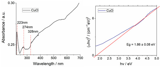 Figure 3 (on the left) shows the UV–Vis spectrum of CuO. Two absorption bands at 223 and 274 nm are displayed. The absorbance increase from 300 nm reveals the capacity of the material to absorb material within the visible spectrum (from 400 to 700 nm).