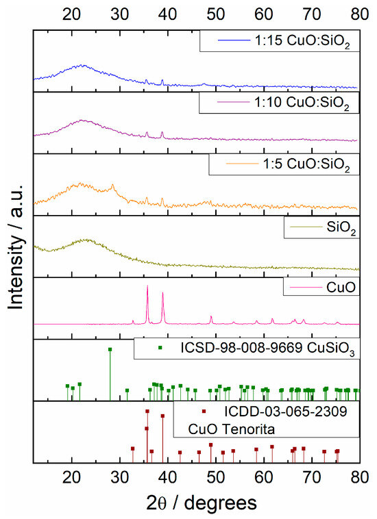 XRD diffractograms of CuO (using the coprecipitation method) and pure SiO2 (using the sol–gel method) in comparison with those corresponding to the CuO/SiO2 systems at different molar ratios (1:5, 1:10, and 1:15).