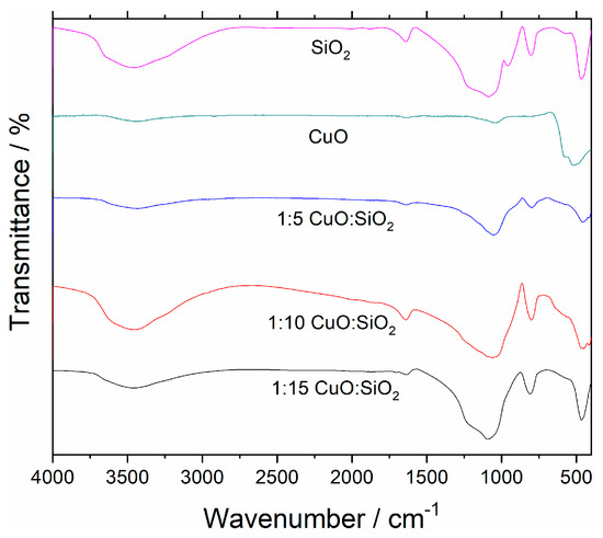 In the spectrum corresponding to pure SiO2, an intense band between 1000 and 1300 cm−1, which is characteristic of the asymmetric stretching of the Si-O bond, was observed. The signal at 957 cm−1 belongs to the Si-OH bond, coming from the surface functionalization of SiO2, characteristic of SiO2 via the sol-gel route [38]. As for the band at 800 cm−1, it is ascribed to the symmetric stretching vibrations of the Si-O-Si bonds. The bending O-Si-O vibrations are represented by a middle intensity band between 400 and 500 cm−1 [39]. The different vibrational modes of the Cu-O bond occur between 400 and 800 cm−1 [40]. The most intense band at 516 cm−1 and 1047 cm−1 is associated with the bending vibrations of the Cu-O bond. A weak band at 1631 cm−1 is derived from the stretching vibration of the Cu-O bond [41]. At 3421 cm−1, a characteristic band of the O-H bond, stemming from water present in the environment and adsorbed by CuO, becomes visible. For the CuO/SiO2 system at a 1:5 molar ratio, bands from the different vibrations of the Si-O bond in SiO2 are observed. This system contains the highest amount of CuO, but due to the fact that the vibrations of the Si-O and Cu-O bonds occur in the same region, the characteristic CuO band overlaps those of SiO2. Likewise, the concentration is a function of the material absorption, and in the CuO/SiO2 system, CuO has the lowest concentration of the three proposed molar ratios. For this reason, in the systems with the 1:15 and 1:10 molar ratios, the characteristic SiO2 bands are more evident.