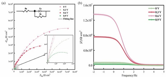Figure 6 shows the EIS images of the scratch-free samples under different protection voltages. In the proposed system, the metal substrate and the graphene conductive coating underwent galvanic corrosion under impressed voltage. Although the metal substrate received electrons, the graphene coating used as an auxiliary anode suffered some deterioration during use, resulting in an overall reduction in impedance []. The Nyquist diagram (Figure 6a) shows that the impedances of the samples with impressed voltages were lower than the sample without impressed voltages. Moreover, the impedance of the impressed voltage samples did not linearly change with the impressed voltage. When the impressed voltage was 0.6 V, the impedance was closest to the sample without impressed voltages and much greater than the samples with impressed voltages of 0.6 V and 0.9 V. Thus, a high impressed voltage effectively protected the metal substrate better and increased the degradation of the graphene coating.