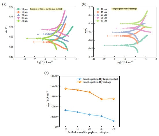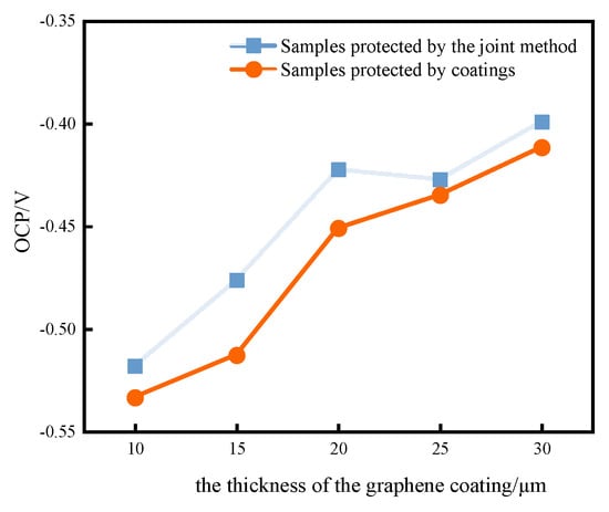 - As the thickness of the graphene coating increases, it becomes increasingly difficult for the corrosion products to reach the metal substrate; thus, the open-circuit potentials shift in the positive direction. Moreover, the scratched samples with impressed voltages have higher open-circuit potentials and lower corrosion current densities than those without impressed voltages. This further confirms that the method provides excellent corrosion protection. Considering the efficiency of corrosion prevention methods and the cost of application, the protective characteristics of the combined anticorrosion system are ensured by the optimal thickness of the graphene coating of 20 μm.