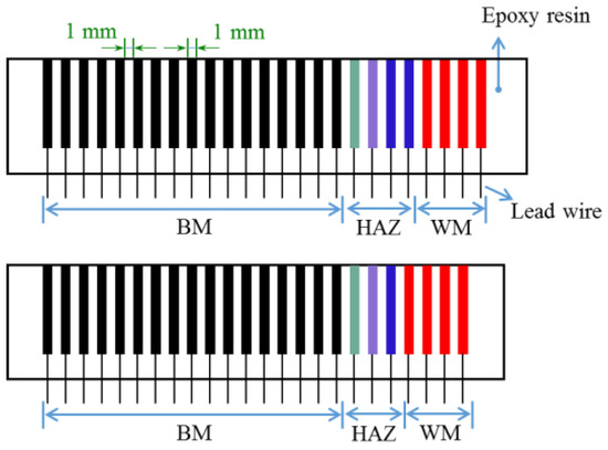 As shown in Figure 1, two simulated welded joints of X80 steel with different area ratios, including BM:HAZ:WM = 17:4:4 and BM:HAZ:WM = 17:3:4, were prepared in this paper to study the influence of medium factors and different area ratios on the corrosion behavior of simulated welded joints of X80 steel. Using the array electrode testing system for electrode coupling/uncoupling control, the welded joint of BM:HAZ:WM = 17:3:3 and BM:HAZ:WM = 8:3:4 can be obtained through the welded joint of BM:HAZ:WM = 17:3:4. The simulated welded joint of X80 steel with BM:HAZ:WM = 17:4:4 consists of 25 microelectrodes; from right to left, the first four are WM microelectrodes, and the adjacent ones are 4 HAZ microelectrodes, including 2 CGHAZ microelectrodes, 1 FGHAZ microelectrode and 1 ICHAZ microelectrode, and the rest are BM microelectrodes. The simulated welded joint of X80 steel with BM:HAZ:WM = 17:3:4 consists of 24 microelectrodes; from right to left, the first 4 are WM microelectrodes, and the adjacent ones are 3 HAZ microelectrodes, including 1 CGHAZ microelectrode, 1 FGHAZ microelectrode and 1 ICHAZ microelectrode, and the rest are BM microelectrodes.
