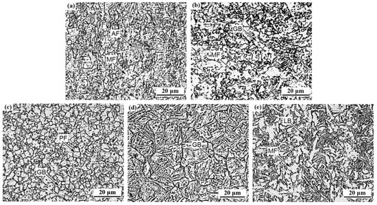 Microstructures of the simulated X80 steel welded joint. (a) base metal (BM), (b) intercritical heat affected zone (ICHAZ), (c) fine grain heat affected zone (FGHAZ), (d) coarse grain heat affected zone (CGHAZ), (e) weld metal (WM).