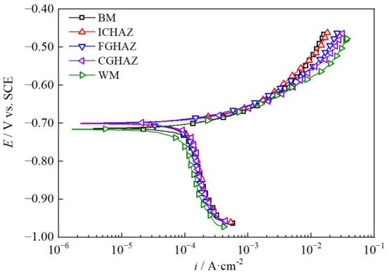 The potentiodynamic polarization curves of the isolated regions of the simulated X80 pipeline steel welded joint in CO2-saturated solution are shown in Figure 3. As a weak acid, H2CO3 partially dissociates to give hydrogen ions, that is, H2CO3 acts as a “reservoir” of hydrogen ions [25].