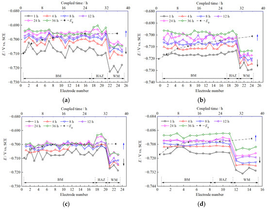 In Figure 4a, the maximum potential difference between the microelectrodes of the simulated X80 steel welded joint with BM:HAZ:WM = 17:4:4 was 21.9 mV and stabilized at 17 mV with increasing immersion time, and after 36 h, the Eg value was −0.696 V. In Figure 4b, the maximum potential difference between the microelectrodes of the simulated X80 steel welded joint with BM:HAZ:WM = 17:3:4 was 20.9 mV and stabilized at 20.0 mV with increasing immersion time, and after 36 h, the Eg was −0.701 V. In Figure 4c, the maximum potential difference between the microelectrodes of the simulated X80 steel welded joint with BM:HAZ:WM = 17:3:3 was 22.7 mV and stabilized at 18.3 mV with increasing immersion time, and after 36 h, the Eg was −0.699 V. In Figure 4d, the maximum potential difference between the microelectrodes of the simulated X80 steel welded joint with BM:HAZ:WM = 17:3:3 was 21.0 mV and stabilized at 14.0 mV with increasing immersion time, and after 36 h, the Eg was −0.703 V. Comparing Figure 4a with Figure 4b, it can be seen that the area of CGHAZ in HAZ was reduced by 0.1 cm2, and the galvanic potential of the simulated X80 steel welded joint had a negative shift of about 5 mV. According to mixed potential theory, the anode metal and the cathode metal are polarized toward each other [31]. The galvanic potential of the simulated X80 steel welded joint is between the most positive potential and the most negative potential. The CGHAZ potential was greater than that of the simulated X80 steel welded joint, and the area of CGHAZ decreased, resulting in a negative Eg value. When comparing Figure 4b,c, it can be seen that the area of WM in the simulated X80 steel welded joint decreased by 0.1 cm2, and Eg was positively shifted by 2 mV. Comparing Figure 4b with Figure 4d, it can be seen that the area of BM in the simulated X80 steel welded joint was reduced by 0.9 cm2 and the Eg value was negatively shifted by 2 mV. Changes in Eg value show that the area changes of WM and HAZ in the simulated X80 steel welded joint have a greater influence on the Eg value than in the other regions.